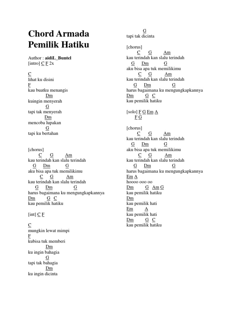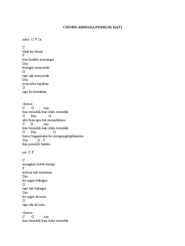 Kau C terindah kan G selalu A m terindah Harus G bagaimana D m ku G mengungkapkannya D m Kau pemilik G hati C ku intro. Chord Armada Pemilik Hatiku - intro C F 2x C lihat ku disini F kau buatku menangis Dm kuingin menyerah G tapi tak menyerah Dm mencoba lupakan G tapi ku bertahan chorus C G Am kau terindah kan slalu terindah G Dm G aku bisa apa tuk memilikimu C G Am kau terindah kan slalu terindah G Dm G harus bagaimana ku mengungkapkannya Dm G C kau pemilik hatiku int C F C mungkin lewat mimpi F kubisa tuk memberi Dm ku ingin bahagia G tapi tak bahagia Dm. F G Am kemarinku melihatmu F G C kau bertemu dengannya.