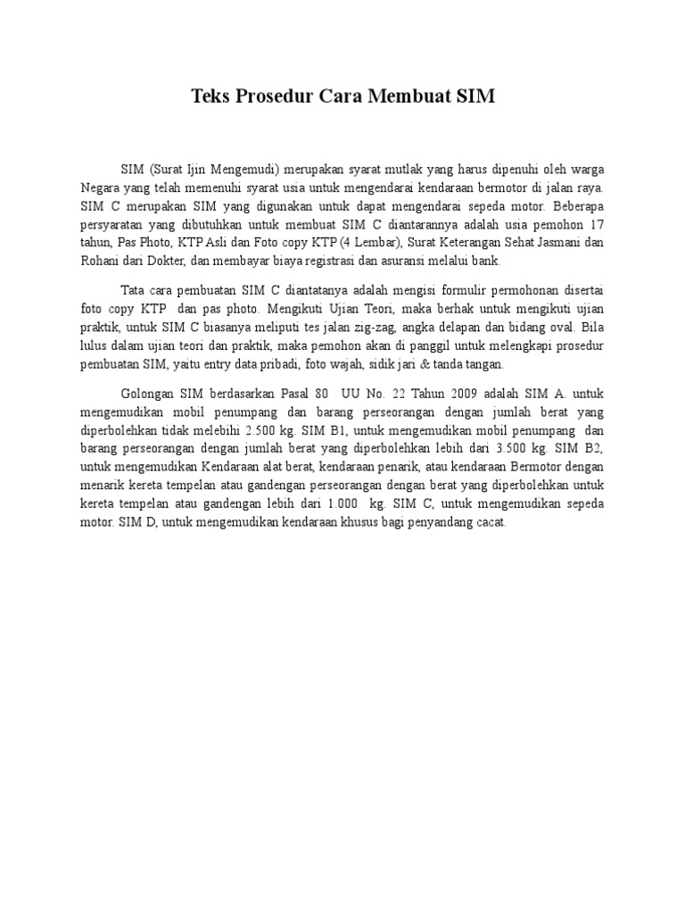 Persyaratan Sebelum ke cara pendaftaran dan pembuatan SIM sebaiknya pahami dulu syarat membuat SIM. Cara membuat SIM C yang benar dan resmi ada yang pernah melakukan. Teks Prosedur adalah suatu bacaan yang berisikan cara untuk membuat atau melakukan sesuatu langkah demi langkah secara urut hingga mencapai tujuan yang diinginkan sedangkan menurut KBBI Kamus Besar Bahasa Indonesia prosedur adalah tahap kegiatan untuk menyelesaikan suatu aktivitas.